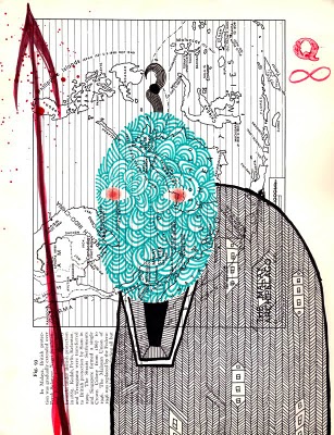 Now you’re also noticing that there’s all kinds of diagrams behind Ahab. Kish used to work at a bookstore and he hated seeing old pages of books thrown away (he has since become a librarian, which makes sense–although as I librarian I learned that librarians are actually quite cavalier about throwing away old books once they are beyond use). So he brought these pages home. And, given the density of the layers of meaning in Moby-Dick, he decided to draw his pictures on these old pages. So on virtually every page you can see something in the background. Most of the time they are these circuital diagrams, which are wonderful. But there are several drawings where the found pages are pages of text from books. And I have to say if these were serendipitous findings then he has amazing fortune. Some of the pages tie in so perfectly it is wonderful.