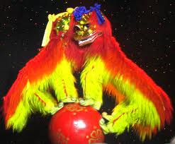 And finally, the most visually arrested spectacle was when they came out and did the lion dance. Dressed in the style of Chinese Dragons (big heads in front of long draped bodies) two people danced, climbed steps, leaped over each other and walked back and forth and up and down a ramp on a large ball. Now obviously we knew there were people in the costumes, but they moved with such precision that it was easy to believe that this was an animal. And you watched them thinking, wow, how does a lion do that, and then remembering that it is really two people working in perfect synchronicity and that was even more amazing.