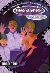 Book #8, Doom Star, is the final book in the series. Zoa is back after the failure of the space shuttle plot. She wants to get the Photon Crystal which she will use to alter time. I liked that this one really played with our minds time-wise. Ned Banks invented bloogball in 2024 and as the book opens they are in the year 2099 playing a holographic version of the game. And yet the “present” in the book is the 20th century, so as we are reading the present, Ned has no idea that bloogball exists. It’s fun to wrap your mind around that. I wonder if C. ever really “got” that concept. And, oh yes, the adventure is very exciting in this one too. Zoa seems to be one of those monsters that would be impossible to beat. I’ll offer one spoiler–the series ends here, but it’s not because the Time Surfers are killed.