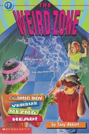 Book #7 has the most puzzling title of the bunch: Cosmic Boy vs Mezmo Head! Who is cosmic boy? Who is mezmo head? The riddle is solved pretty quickly. Cosmic Boy is a superhero from a TV show the kids watched when they were little (he has a theme song too). And Jeff Ryan has the Cosmic Boy helmet toy still and he is wearing it right now. The reason he has it out is because his school is putting on a new version of The Wizard of Oz, but set in outer space (I would love to see that) and he is bringing his own prop. But when he and Sean Vickers are standing outside of the X-Rays R Us building, they see a man with a cabbage in front of his head operating the giant X-Ray machine. The machine sends out a gigantic pulse and a sudden blinding light and Crash. Turns out the man with the cabbage is an alien named Klatoo (the fact that Sean can’t get the alien’s name right through the whole book cracks me up–Abbott uses this kind of joke in Droon and I liked it then, too).