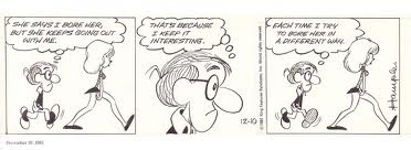 The book is broken down into subjects and is in no way chronological. This makes sense as it’s good to see him dealing with the same topic in different ways, but it makes for weird continuity issues (something that will obviously occur when you only select random strips). Woody is with various women over the strip and it’s hard to know if he was after Laura for a few months or the duration of the strip. Of course, the sections aren’t really all that different–they all deal with Allen’s philosophical attitude, his attempts to woo women, his therapist and his parents. However, the breakdowns, while somewhat arbitrary are enjoyable.