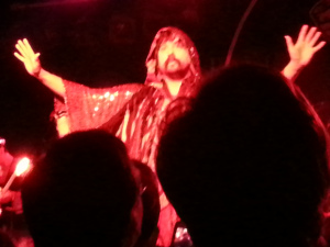 For the final song all four members leapt in the air in synch with the pauses. Three or four times, the guitarist for Gogol Bordello came out in a weird costume and marched around the stage, but he wasn’t the most interesting thing to look at by a long shot.