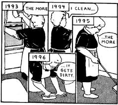 The action is set mostly in his childhood home in Perth Amboy, New Jersey. He researched recent and ancient history. The unmoving point of view is what allows him to travel all over the place. Originally he was going to split the comic in half with one half going forward and the other going back, but computer technology allowed him to break up the frames in what ever way he wanted So events that occurred (or will occur) are a fire (1996) a burglary (1997) a partial collapse (2015) and a flood (2111). In a real scene from his youth, archaeologists asked if they could dig in the yard for Indian artists (his mother said no). I really liked the cartoon without this information and I like it a lot more with it. I am genuinely looking forward to his book form of Here. (which I see came out in December, but was out at my library).