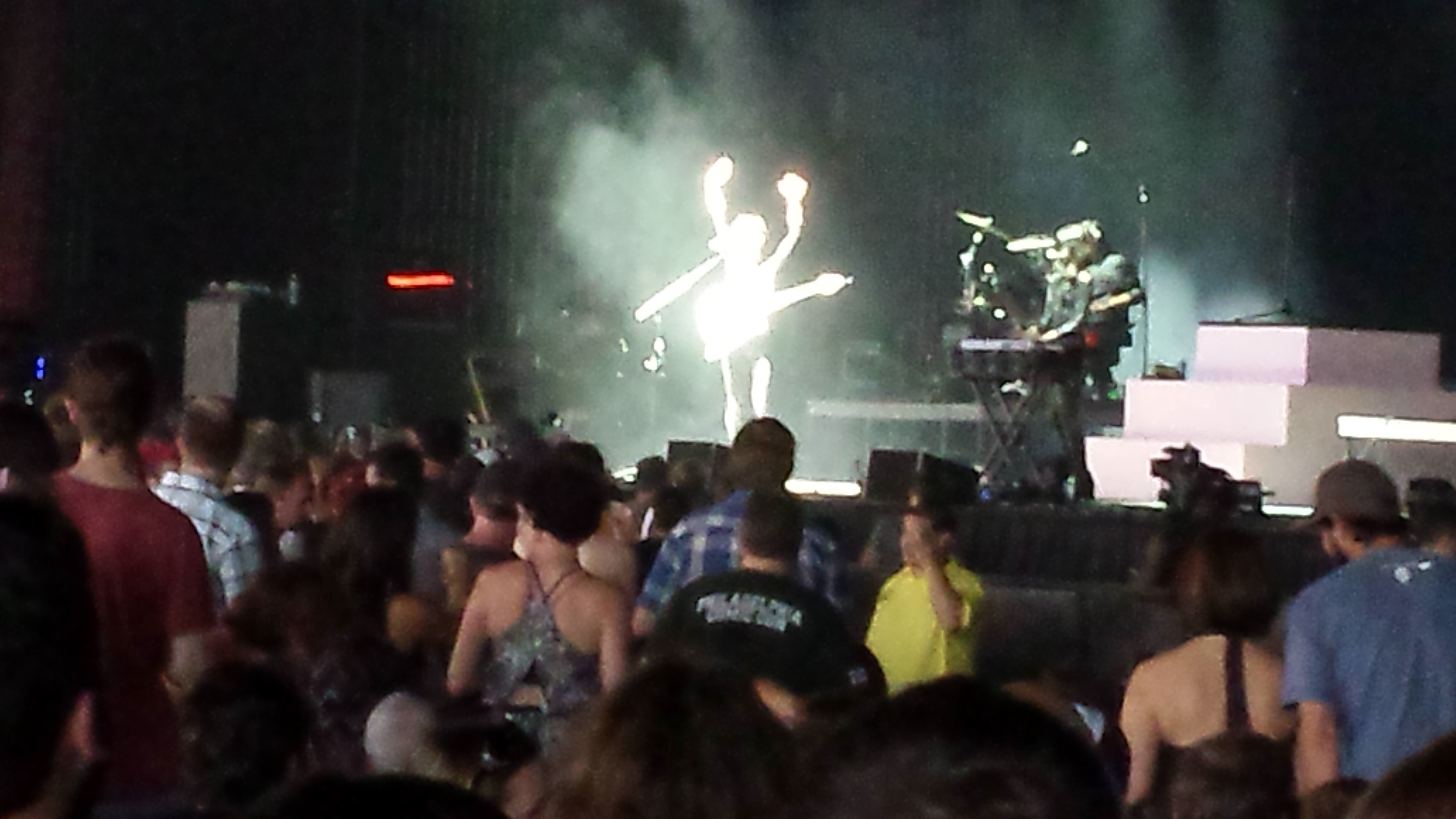 But then she came on and all was well. It was superb in fact. Annie Clark is mesmerizing on stage (even from that far away). I don’t usually mention what people wear (although I will for Jim James too), but she came out in this sort of body suit with crescent moon cut outs from ankle to shoulder. It was quite arresting. Made only more so that her keyboardist/guitarist Toko Yasuda was wearing the same thing. So when they did synchronized moments (which they dis many times) it was very cool indeed.