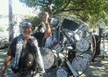 Clyde Casey was a street performer in the 1980’s who would often perform in the parking lot of LA’s Wallenboyd, the experimental theater space where John Cusak, Tim Robbins and many others got their start. One night the theater’s security guard didn’t show up, so they asked Casey if he could keep an eye on their patrons’ cars before and during the plays. He agreed, but only if he could stay in character. Festooned with toys and musical instruments and homemade chrome-painted sculpture, he metamorphosed himself into a surrealist crime fighter, keeping Skid Row safe using only the powers of art. That night, Clyde Casey became “The Avant Guardian.”