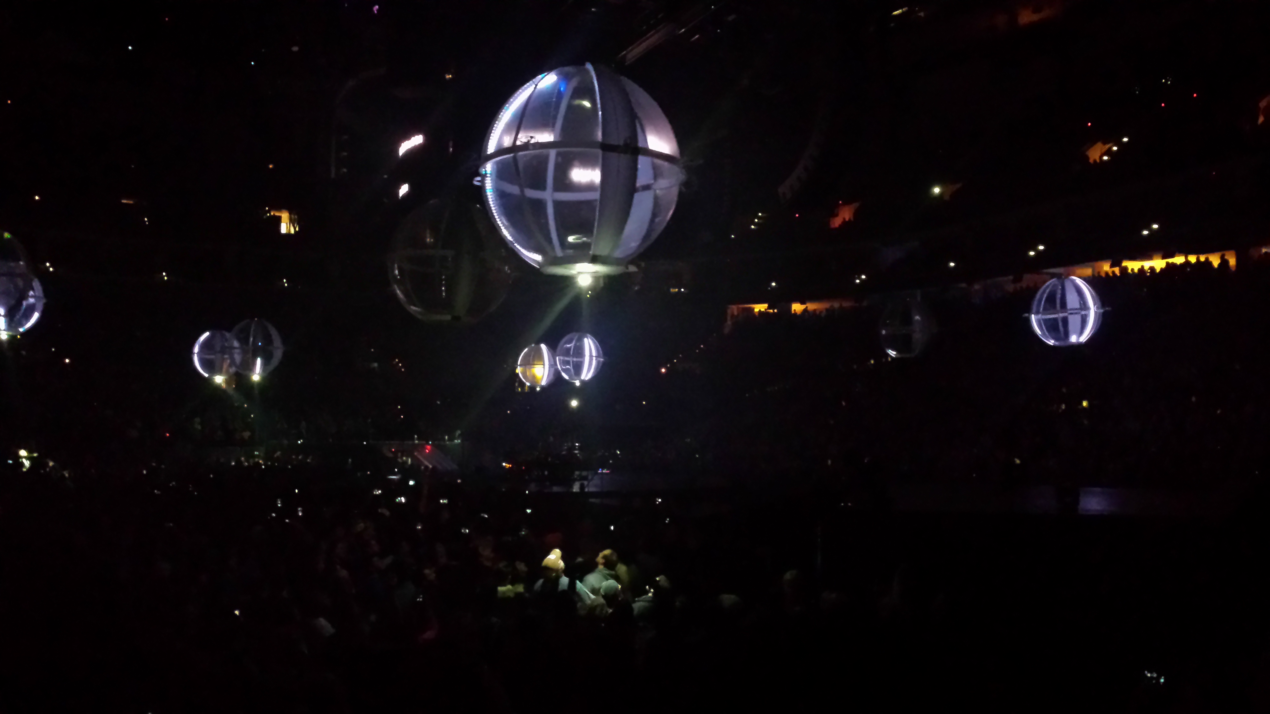 The giant orbs lit and up descended from the rafters while the prerecorded “Drones” played. These drone balloons had lights on the bottom which scoped out the audience.