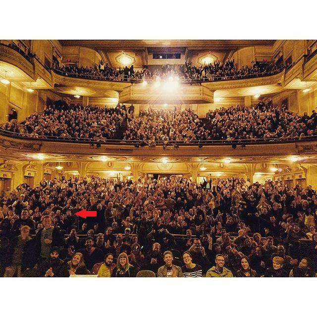 On his Facebook site, he talks a bit about each show. It sounds like people were walking out on him in droves at different venues. I didn’t see anyone leave (well, people left but they all came back), but we were in Row J, so I don’t know what happened behind us. And at the end of each concert he takes a photo of the audience. It’s hard to tell for sure because it’s pixelly, but I’m pretty sure that’s us where I put the arrow.