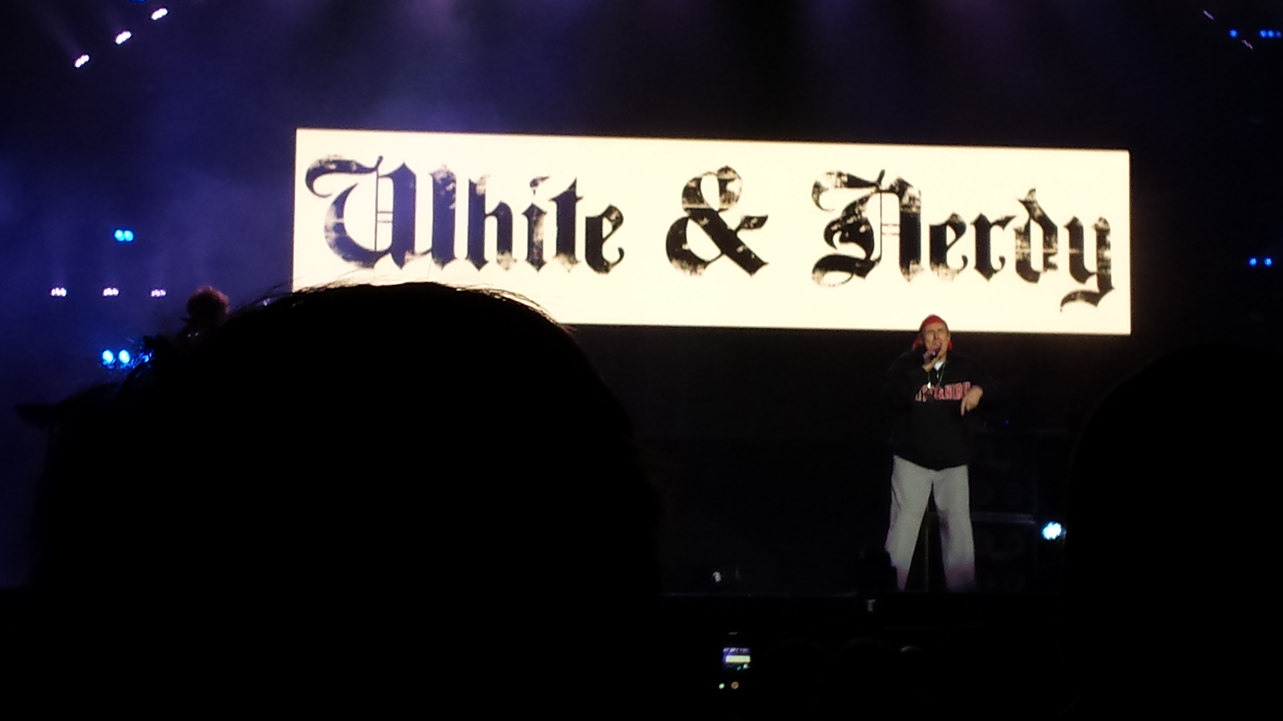 But even the ones that I’ve seen before (some now possibly 5 times) are always funny–especially if the crowd is really into it. The clips where he “interviews” celebrities are always amazing. I love that the Michael Stipe interview leads to a song about 20 minutes after the fact. T. fondly recalled the Celine Dion/cannibalism joke and we had to try to explain what she might have meant by “I smelled mummy cooking.” And of course, there’s Eminem “know what I’m sayin?” and his abyssmal language skills which lead to an awesome version for “Word Crimes” (which I somehow forgot about even though I love the song and Sarah has just bought a short of it).