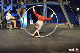 In addition to the main woman and the singer, the third woman (whose character was known as The Kid) was an amazing asset to the show,. Not only did she perform some amazing feats of strength and acrobatics, she also played violin sometimes. (She is a classically trained violinist in addition to being an acrobat). The two women performed an amazing act up in the air on the chandelier. It was spinning act in which the two women held each other up and hung off of each other in fascinating ways. One oft he times, the woman was held by the back of her head–how?. Later she also did a fun demonstration of the large Cyr wheel (that was done to “Crazy”). I don’t know that she did anything especially inventive with the wheel, although her size (she was kind of short) allowed her to be fully inside the wheel, which I think some taller performers can’t do.