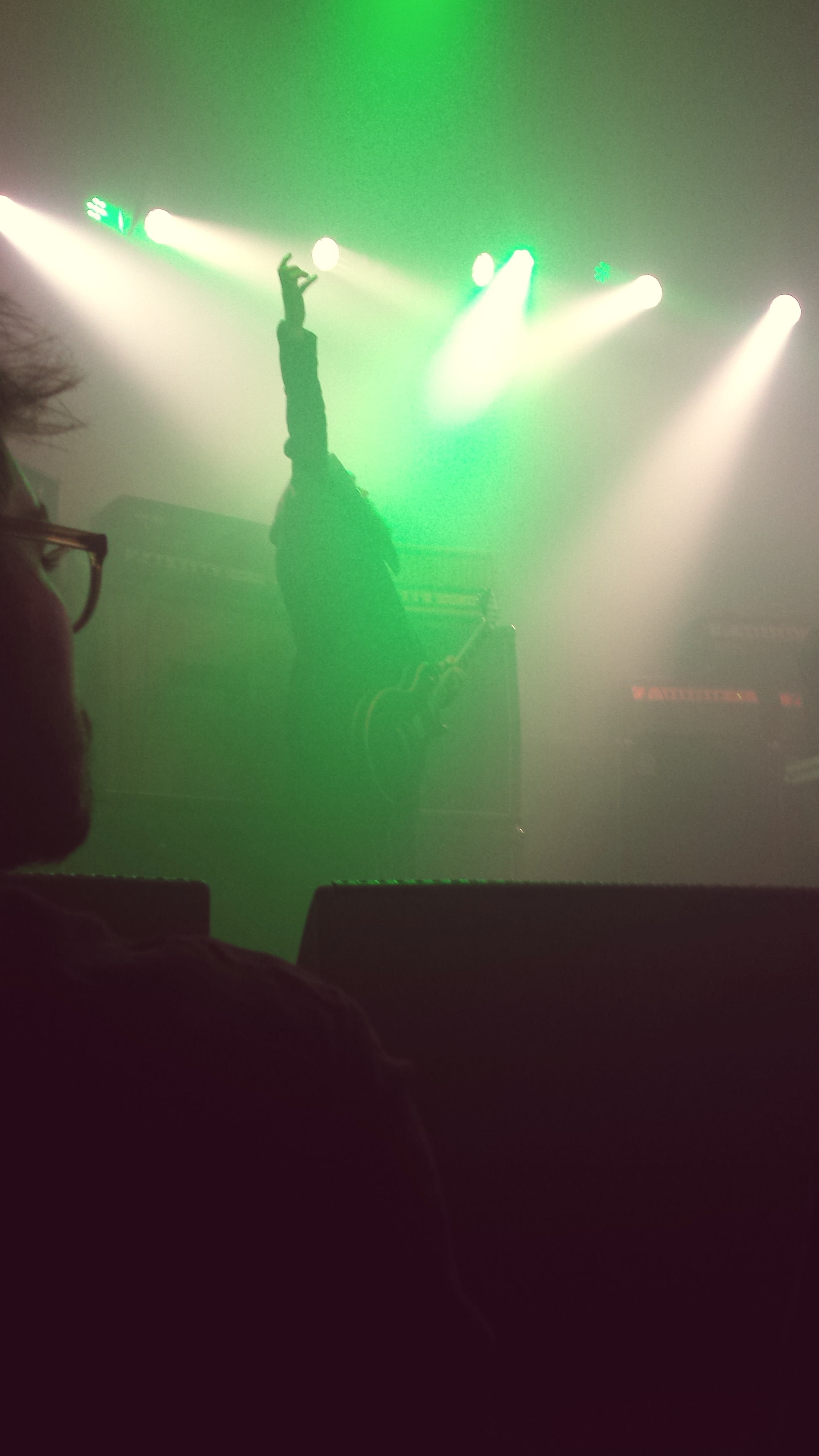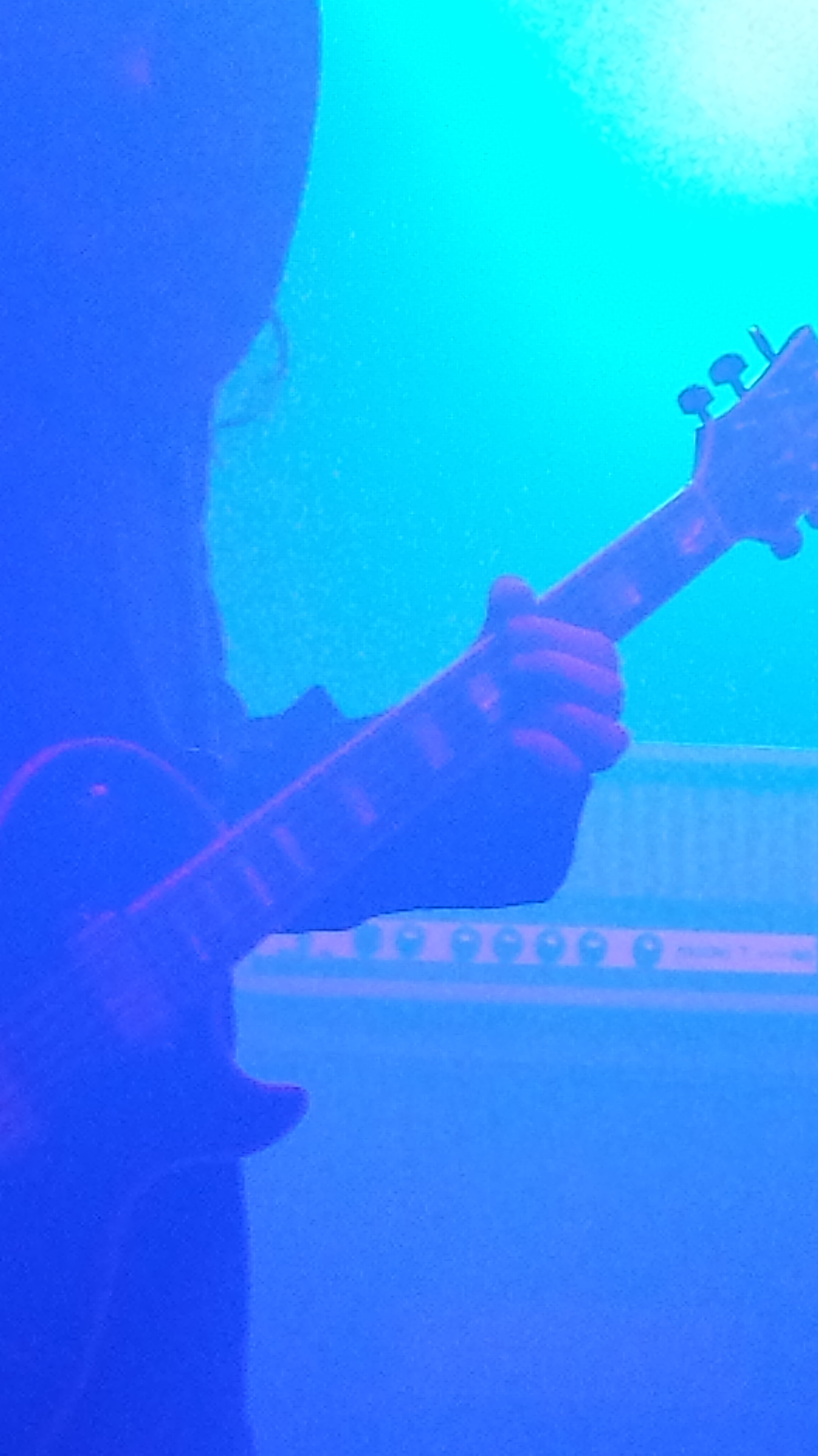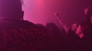 Lately I have been getting pretty close to the stage for shows–I’ve been really enjoying seeing the bands so close. I had guitarist Greg Anderson in front of me (check out that chord on the left). And not having tall people in front of me is also great. I enjoyed watching Anderson do things. Although I could never really see the other guitarist, Stephen O’Malley with all that fog, I was glad to get a picture of his see through guitar (right).