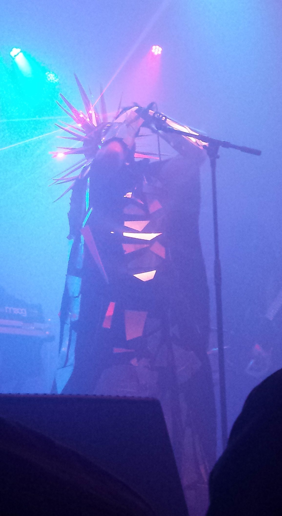 The fog started about ten minutes before the band came on. Fog and fog and more fog. You couldn’t even see the balcony, there was so much fog (left). And then out walked a hooded figure (above). It was Attila Csihar, the vocalist. He spoke in a strange language (he is Hungarian but it didn’t sound like Hungarian, but who knows) and then he chanted for a while, making some pretty interesting sounds. He was dramatic and somewhat over the top. At times it felt a little silly.