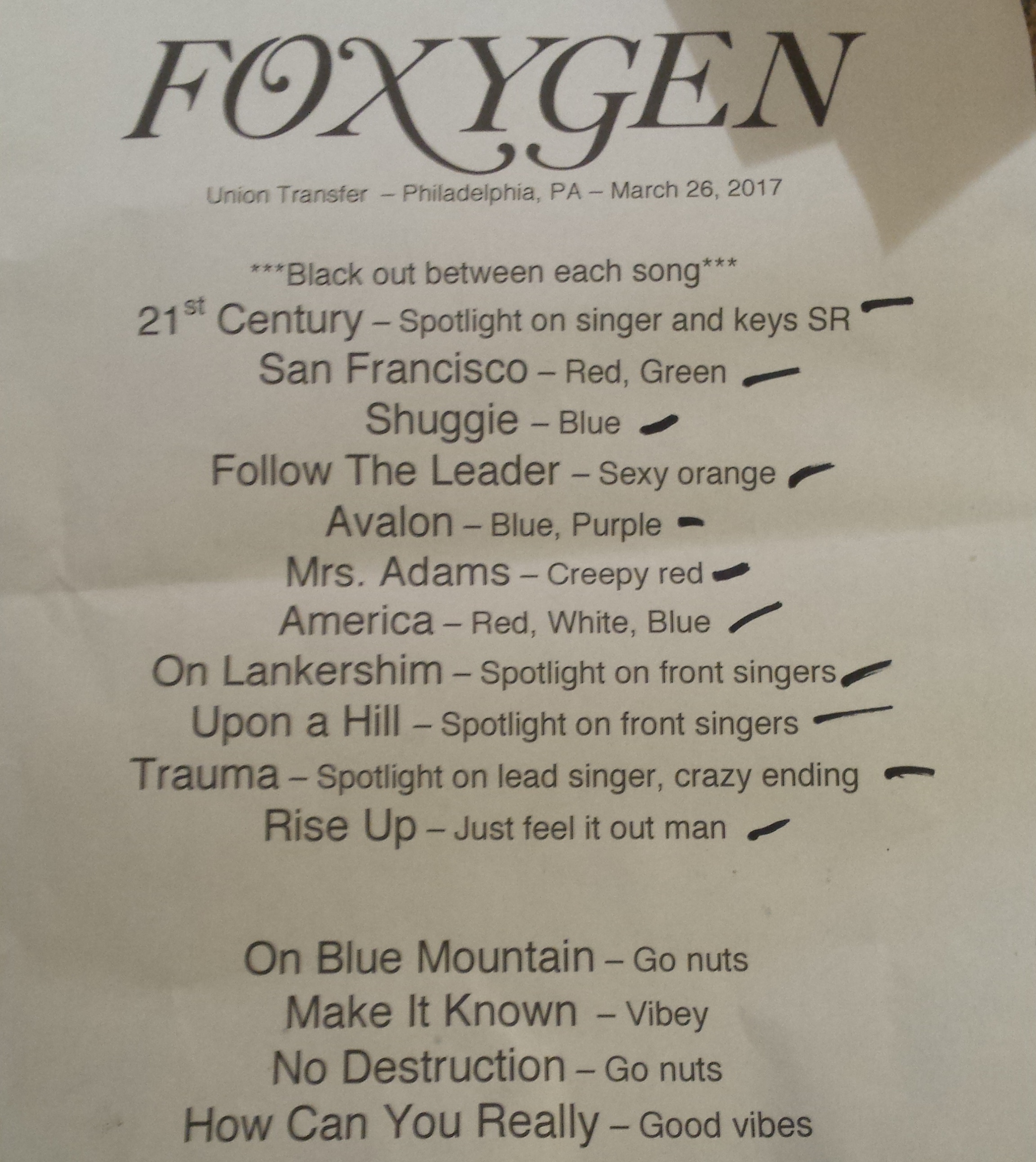SETLIST (and I am sure of this because on my way out, the lighting guy basically handed me his setlist with instructions for lights. So that’s a pretty cool souvenir (better than a sweaty towel, frankly).