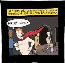 Something I imagine all my scientist friends doing: “Life Tip: You can do petty much anything if you yell the right phrase.” Cut to a naked man running down the hall shouting “For Science!”