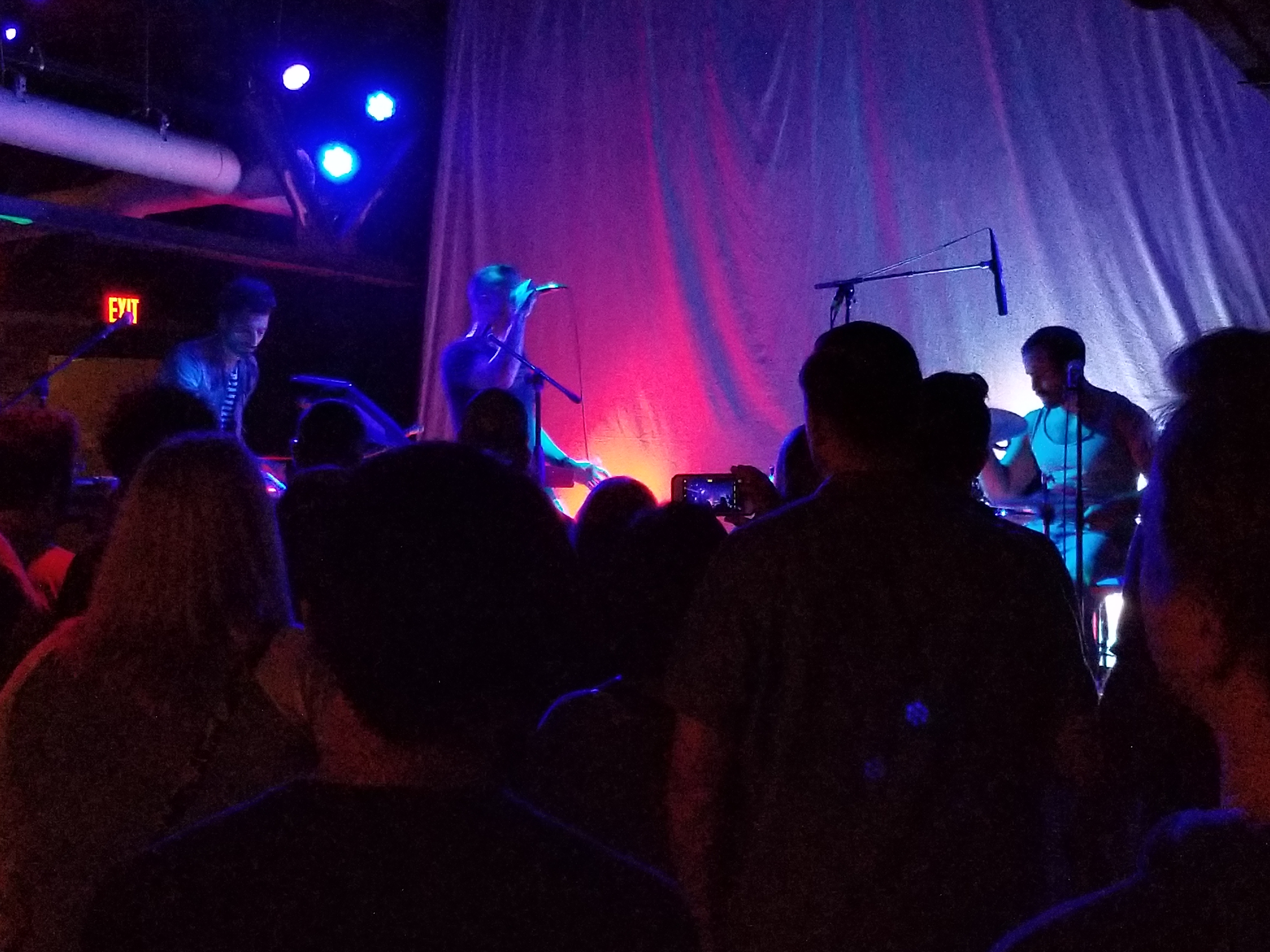 The band is a four piece, but there were only three guys on stage, so I’m not sure if we had Dan Brunell or Saam Hagshenas on synths. He was fun to watch because he had one of those devices with lots of white boxes that light up red when you play notes. What set the band apart from your typical synth pop band was the addition of live drummer Jonathan Marks. Marks’ drums (and especially cymbals) were surprisingly quiet–especially in a small place. But he was really intense, playing some complex rhythms and patterns.