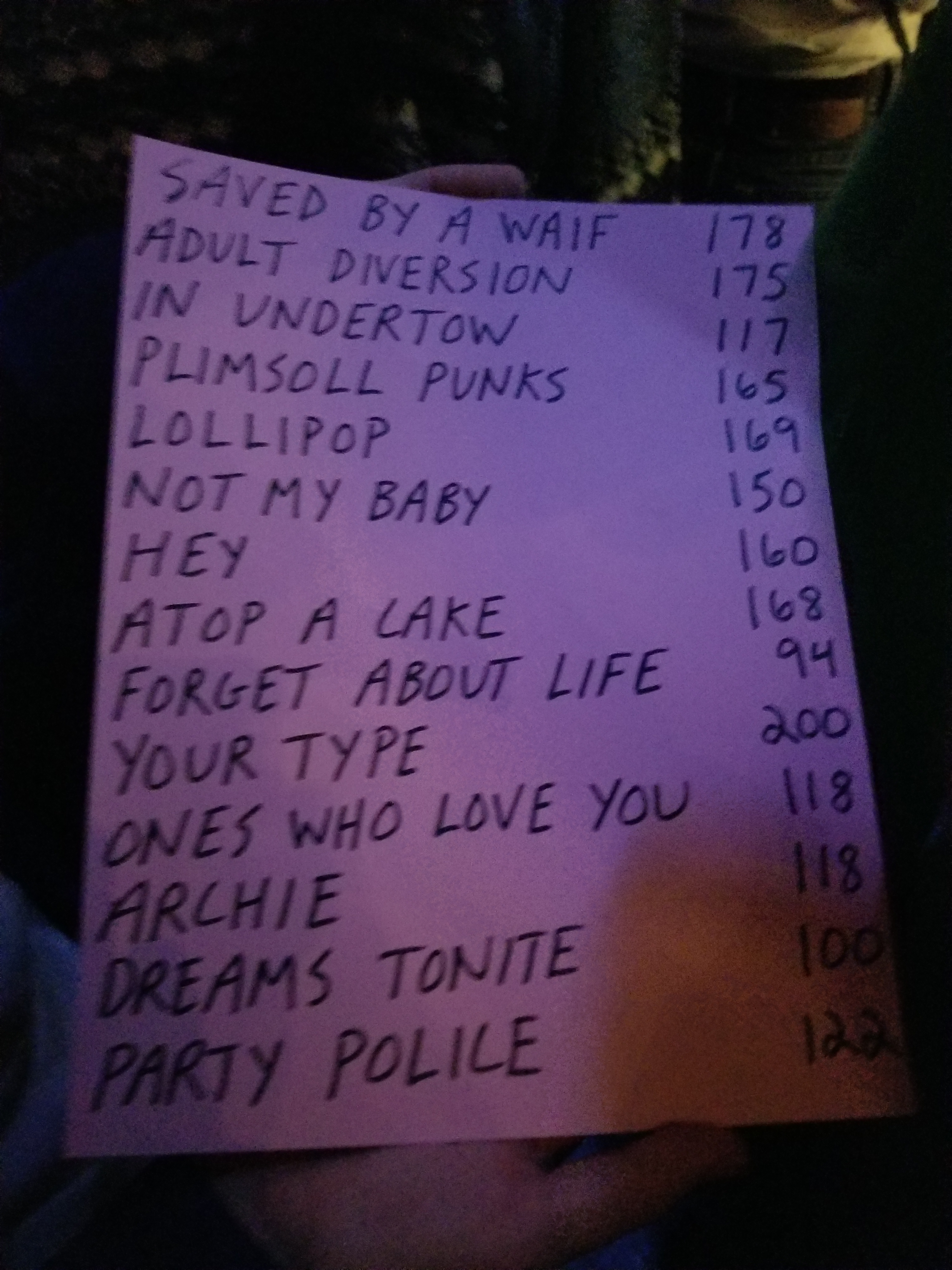 Your Type Next of Kin Ones Who Love You Atop a Cake New Haircut Dives [the one song they didn’t play this time] Adult Diversion Party Police Archie, Marry Me
