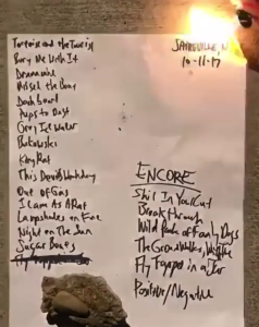 When the show ended, a woman in front of me was given Lisa Molinaro’s setlist (which you can see has all kinds of notations on it, and is even wrong at one point). And later the next day, the band posted a video on Instagram of them burning the full setlist. I assume it was in the parking lot of Starland (it was really windy that night). I was able to get a screen grab before it burnt up. I love that both setlists are dated!