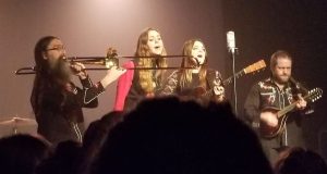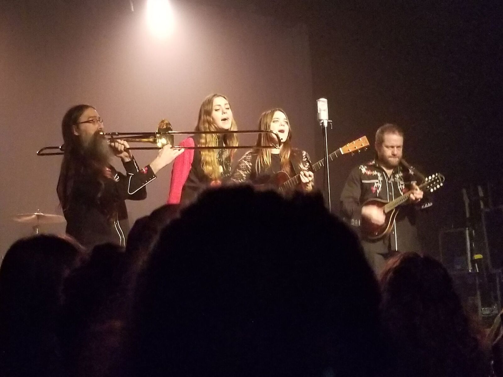 For the first song of the encore, Klara and Johanna gathered around a center microphone and taught us the (rather long and somewhat harder than it seems) la la la melody of “The Hem of Her Dress.” Midway through the song, Steve came out with his trombone, and Melvin came out with his mandolin and by the end even Scott had come out with a hand drum.