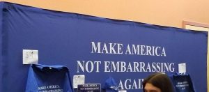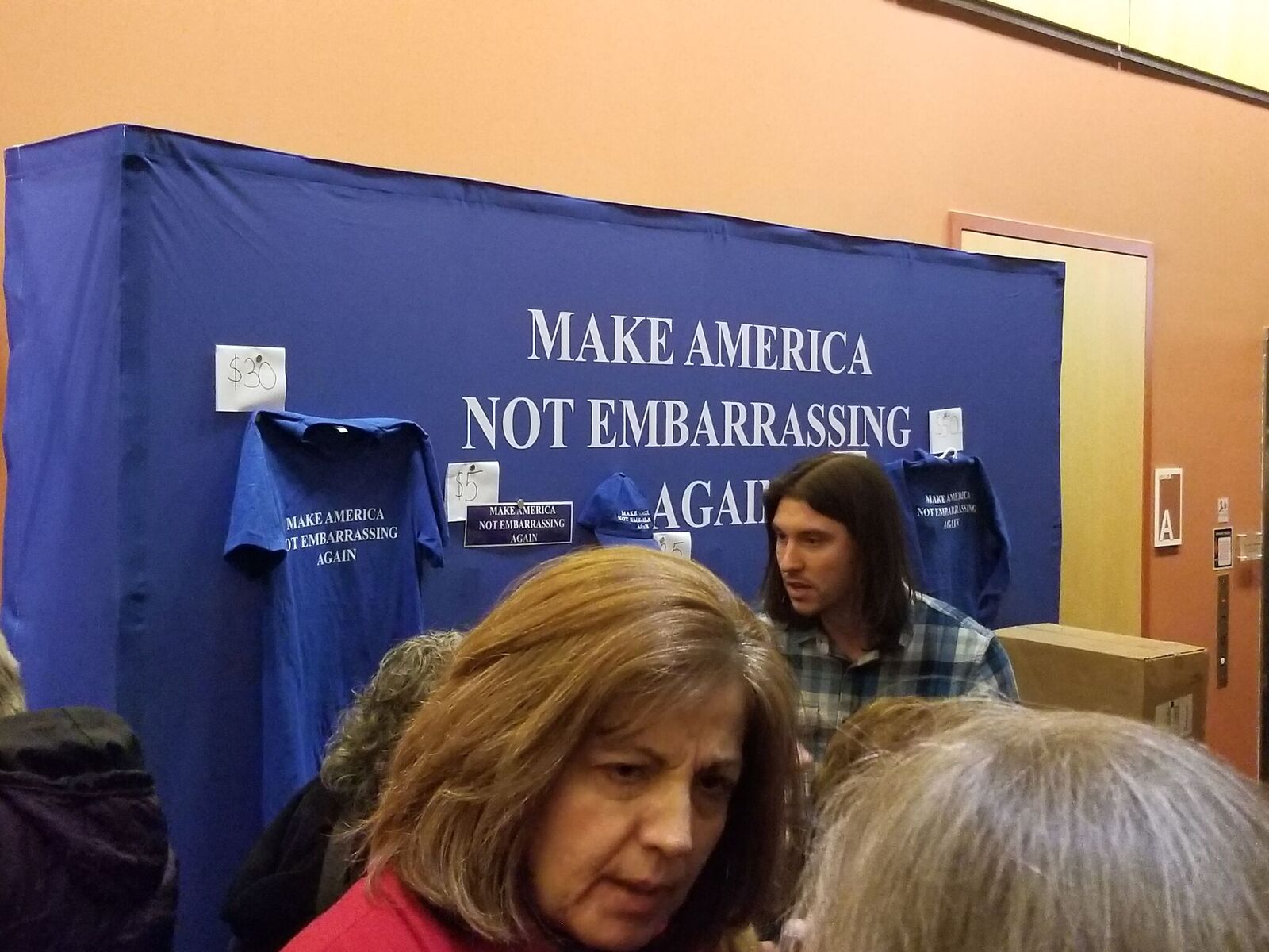 He also had merch for sale, and 100% of Andy Borowitz’s profits from merchandise sales benefit The International Rescue Committee to aid refugees around the world. The merch was simple and straightforward. Shirts and hats in blue that stated: MAKE AMERICA NOT EMBARRASSING AGAIN.