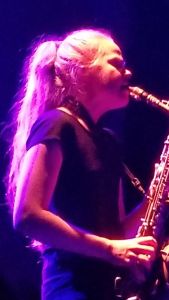 What we saw was Tashi Dorji on guitar and Liberty on sax. Back in college I loved skronking noisy saxophone (John Zorn is still a touchstone for me). But I found that I did not enjoy listening to it live for 35 minutes. Liberty is a wild noisy sax player. She switched mouthpieces a few times during the set (to what effect I’m not sure). And was basically playing loud improvised noise–sometimes it was smooth and clean, but more often it was loud and squeaky.