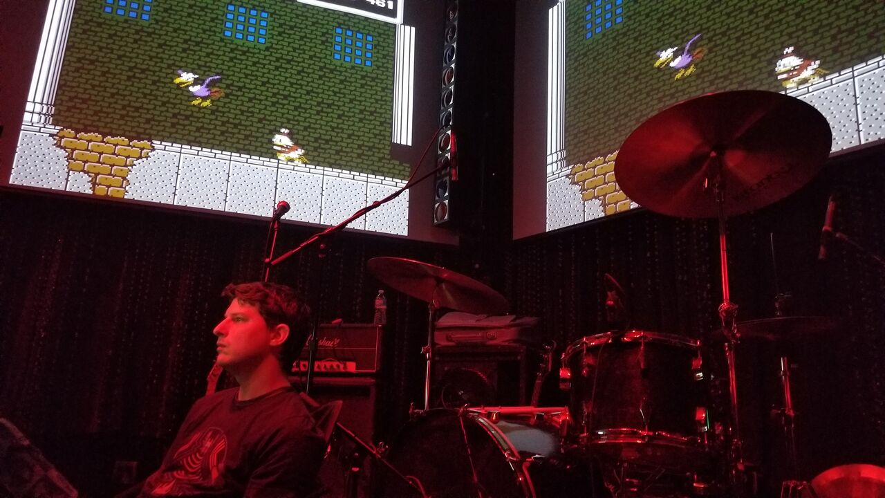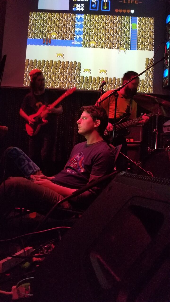 Noah had a TV in front of him and his game was projected on the screens behind them. So the band jammed the music to the game and every time he completed a level or moved to a new area they had to be alert to switch musical themes.