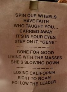 And then they went off the set list by playing “Fading Into Obscurity” (Chris) (“Carried Away” was supposed to be next). It was great to hear this, an obscurish song to be sure, and it set the town for the night. Patrick got one more older song “It’s In Your Eyes,” and it reminded me yet again that I will never be able to determine whose songs I like best.
