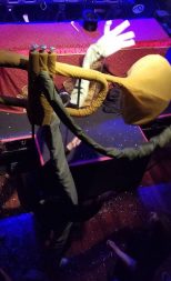 Indeed, what was so cool was how great the audio was by itself. He reproduced songs perfectly (or as “perfect” as a live song should be). One example was “Drunk Trumpet.” This was the first song I’d ever heard by him and I loved it. I was thrilled that he did it live. He said it was dedicated to Louis Armstrong. As he started the turntable, a suitable jazz song began. And then a gigantic eight foot trumpet came out and started “playing” along.