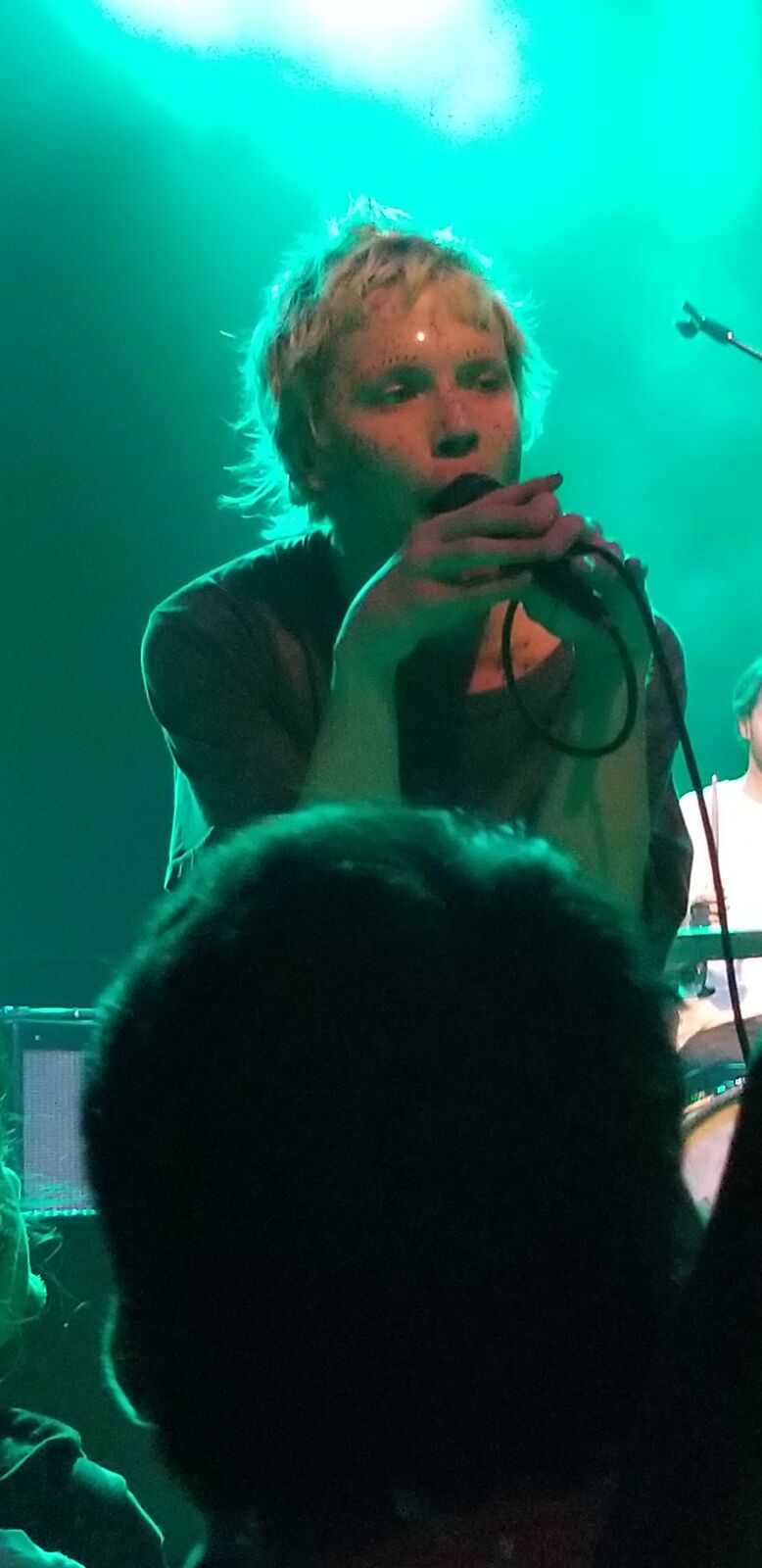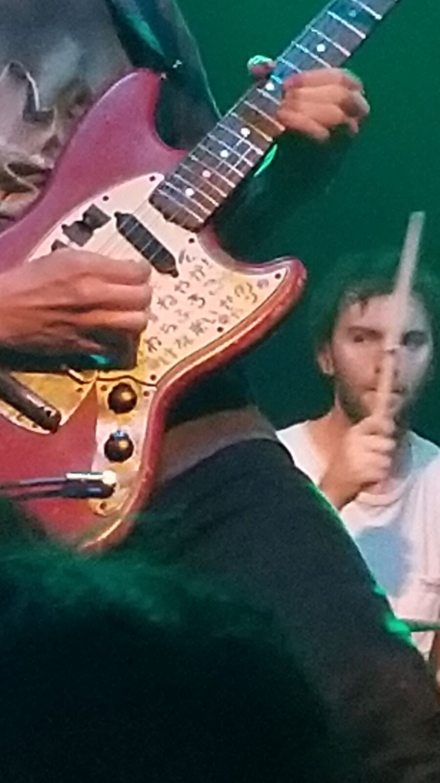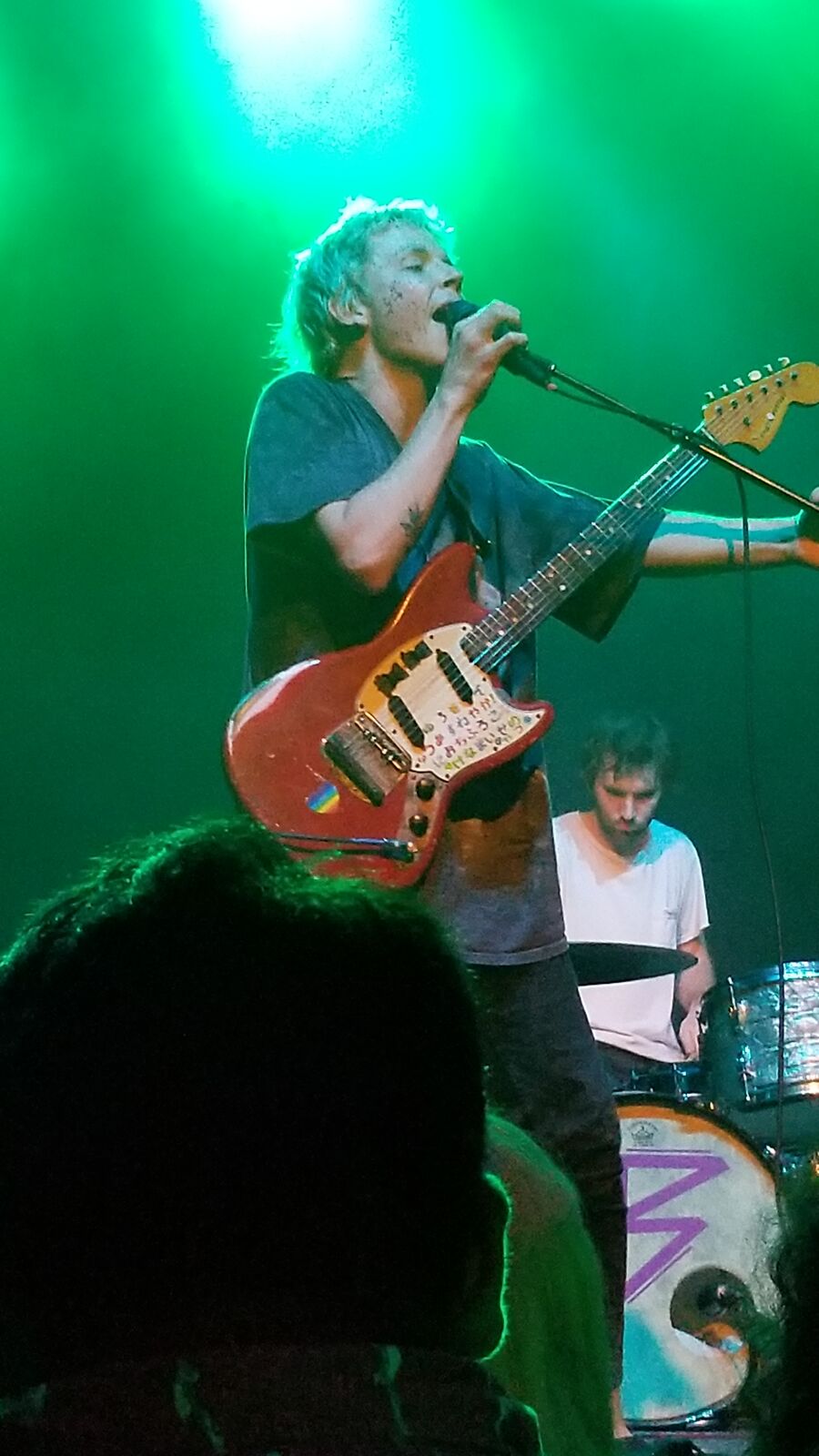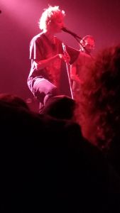 They followed that up with “Waiting Around for Grace.” Allbrook more or less sat right in front of us to sing this Flaming Lips-esque ballad. It was crazy being quite so close to a band that people were going crazy for. I loved being able to see the characters on Allbrook’s guitar and the stickers all over his face.