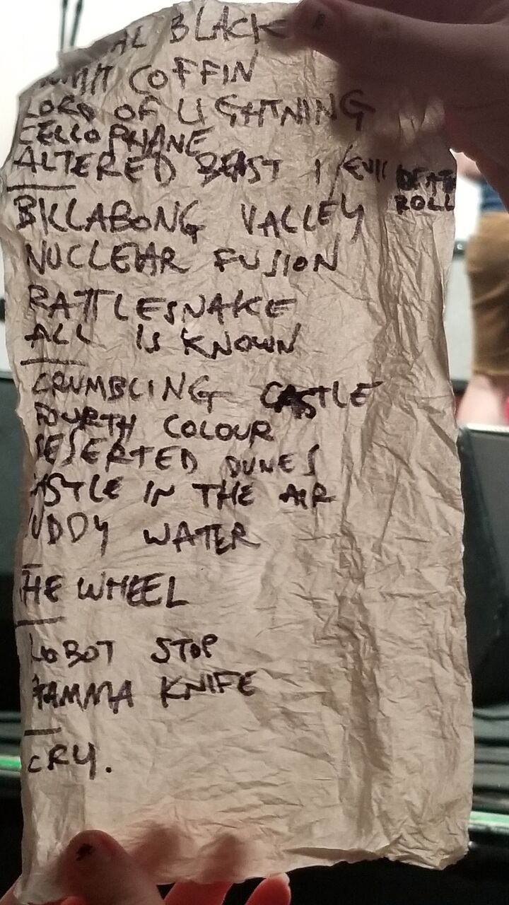 Things slowed down a bit for “Muddy Water” and “The Wheel,” but returning to Nonagon meant the last few songs were just as fast as the earlier ones, “Robot Stop” [Loosen up / Time to drop / Fuck shit up / Don’t forget about it] with the swirling wild background and “Gamma Knife.”