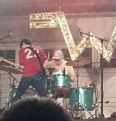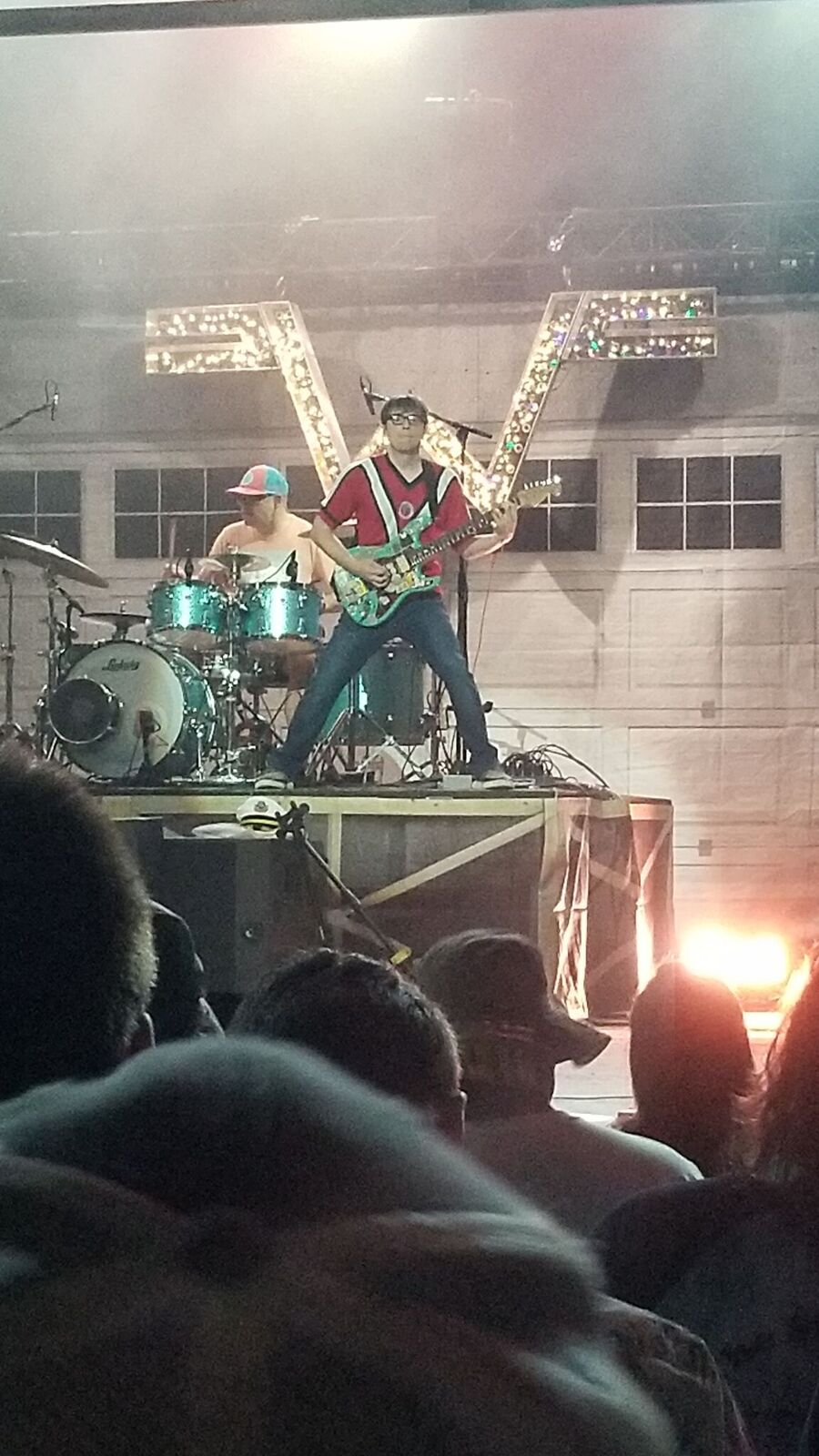 The back of the stage looked like a garage door, the curtains were pulled away to make it look like a 2×4-created stage and a wonderful handcrafted-looking Weezer W above the drum kit.