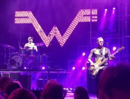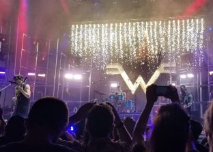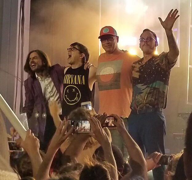 While this was going on, the stage crew was hard at work changing the set around. Obviously anyone in the back of the audience saw the stage stuff happening, but since we in the front were turned around, fully engaged in “Take on Me,” when Rivers scooted back up to the stage (someone there shot this video) it was a huge surprise that the stage had been converted into an iconic present-day Weezer show complete with the giant lit-up Weezer W.