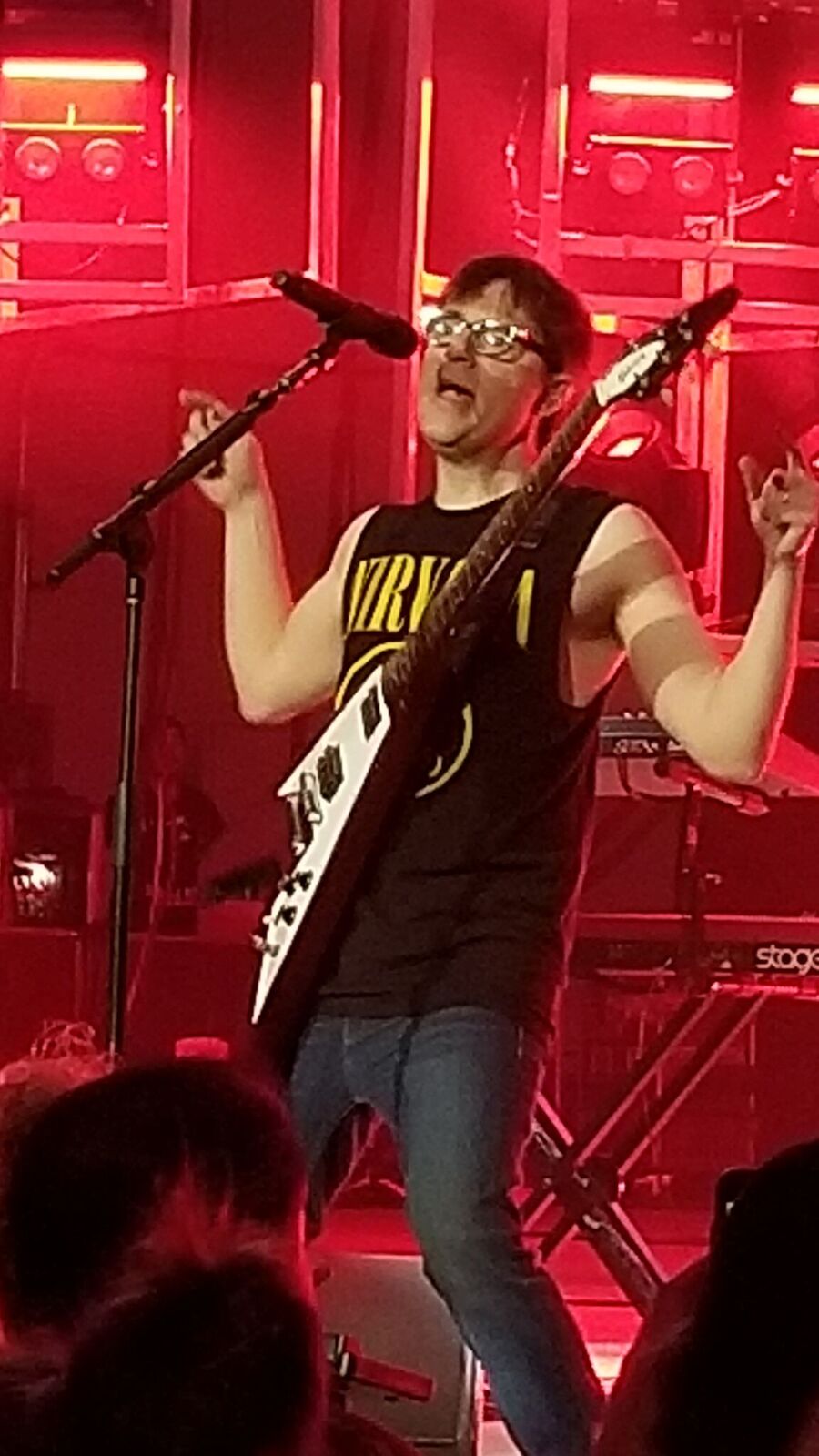 While Rivers was getting rid of the scooter, they played Burndt Jamb, a breezy song. I see from all the concert reviews that they played some of Smells Like Teen Spirit in the song, although I can said that I didn’t realize it–probably because we were all laughing and cheering so much when Rivers came out wearing a Nirvana shirt with the sleeves cut off while playing a flying V guitar.
