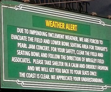 When I saw Phish at BB&T Pavilion, there was lightning right overhead but nothing happened. However, back in 2013, Pearl Jam played Wrigley and there was a storm which delayed the show for hours.