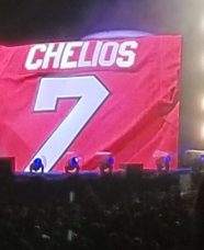 Then Eddie hung a Chris Chelios Chicago Blackhawks’ sweater on the stand in front of him. And moments later Chelios (the team ambassador) came out. But he wasn’t there to celebrate himself, he was there to remember Blackhawks’ legend Stan Mikita, who died earlier this month. Eddie said that the following song, an emotional rendition of “Come Back” would be dedicated to her. He asked everyone to light up their phones, which, as I’ve said, I’ve seen before, but which never ceases to look very cool.
