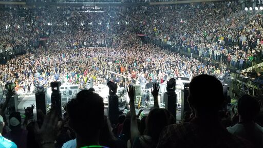 This summer when Armando and I saw Phish they played an amazing version of “Split Open and Melt.” It got really dark and trippy and was a highlight of the two shows for both of us. This is a great song that I love, so I didn’t mind hearing it for a third time. It was great watching it from our vantage point and seeing Fish do his fills. They ended set two with it tonight and this version came a close second, with some great lighting effects as the band took the song to the dark side again. In addition to the groovy bass, this song lends itself to all kinds of musical exploration. One of the cooler things during the jams is when Trey decides to hit some high peaks and Kuroda is there with him. From the front, the lights go bright white and it’s almost blinding. From behind the stage, you get to see the whole arena lit up, which is even cooler. They jammed “SOAM” for over 18 minutes to a satisfying encore break.