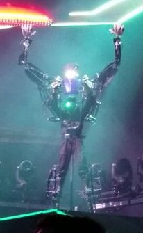 A video game machine came up on stage and guys in oversized robots costumes were on either side of the stage. I had heard that there were giant mechanoids, and I assumed that this is what they had been talking about. I actually assumed that Bellamy was in one, but he wasn’t, he was playing the piano at the end of the catwalk. They played “Algorithm” again, although a different version than the opening song. The dancers also came out with what looked like fluorescent light tubes (I hope they were sturdier than that) and proceeded to do a kind of ninja/dance routine with them.