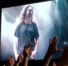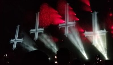 The lights went out and a dark curtain covered the stage. The pre-recorded strains of “Delusions of Savior” played as four crosses filled the screen. They slowly rotated upside down. Everybody went nuts.