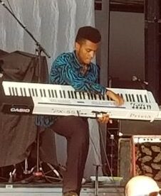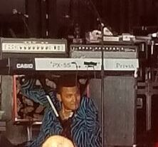Drummer Jacob Faber was tucked away in the back, but he was playing really hard, with some nice fills. Keyboardist Danny Ayala was a lot of fun. He was also wearing a tigerprint shirt (aqua). But it was his stage presence that was so much fun. At one point he seemed to be hiding under his keyboard while still playing and at another point he picked up his keyboard and played it like a keytar except that it was a full size keyboard.