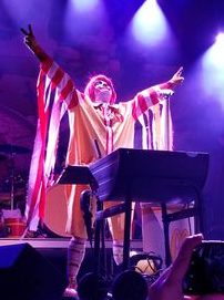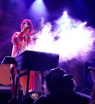 As the show progressed the atmosphere of circus or at least magic show just grew and grew. The second song was “Sweet Beef.” “Sweet Leafs” starts with an echoing sound of someone coughing, “Sweet Beef” started with an echoing sound of Ronald throwing up into a bucket. During the song he proceeded to pour “Pabst Blue Ribbon” (actually water) into the bucket. He then ran around the stage like the Harlem Globetrotters looking to throw the bucket on someone. He chose a woman near me and so I got covered in wet confetti.