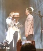 K. moved over to the keyboard for the majorly dancey and discoey “Hey Big Star“. It was just before this song that the girl in font of me gave K. a birthday present in a small box. It was a bow tie. We all sang Happy Birthday as he quickly tried to put it on. He failed at least twice and then said he’d pretend he had it on and had now taken it off. He was genuinely flattered at the gift.