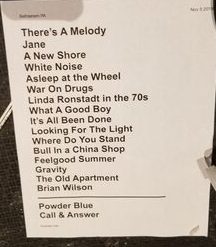 The setlist said they would play “Powder Blue” an old BNL B-side that I don’t know at all. For whatever reason they didn’t play it. Could they really have not played TWO songs on the setlist? The comparison below is a little unfair because the italicized songs were either snippets or done very quickly as a kind of goof. But still, it seems weird that he gave us fewer songs–maybe he was mad at the Roger Stone guy. Or maybe he was annoyed that I didn’t chat with him 🙂