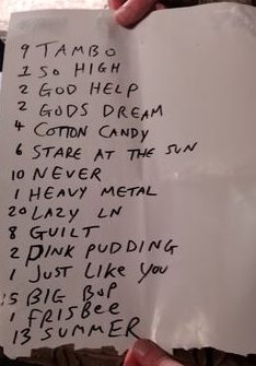 Then a couple more new songs. “Heaven Obscured” (“Pink Pudding” on setlist), which featured some different guitar sounds and a somewhat conventional middle section, and “Just Like You.”