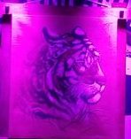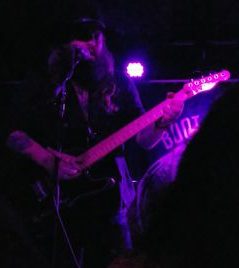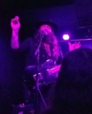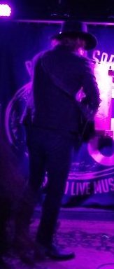 Finally, Tim came out on stage, buried in a purple light that never changed the whole evening (what is going on at Boot & Saddle lately?). He also had his tiger print up on that back wall just like the last times (he’s never explained it and I don’t get it, but I like it).