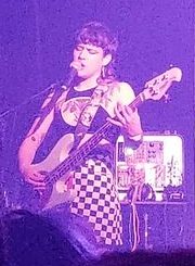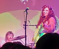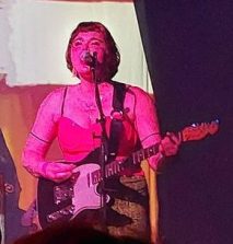 The band came out on stage. Guitarist Brennan Wedl in a hot pink bustierre. Since the band broke up, Brennan has moved to Nashville and is making alt-country albums (!). On the far side from me was bassist Otto Klammer. They were quiet for most of the set until they introduced “Sweet Cis Teen” which they wrote and sang.