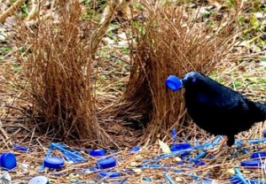 Incidentally, this study was done in 1986, so it does not account for the more recent discovery that bowerbirds will basically use any old crap to build their nests, provided it is colorful. Many people find this sad, but the birds don’t seem to mind. In the article, the author says that one of the birds came up to his colleague, stood on his shoe, and tried to steal the blue docks that he was wearing. Here’s a picture of a bowerbird with a whole bunch of blue clothespins.