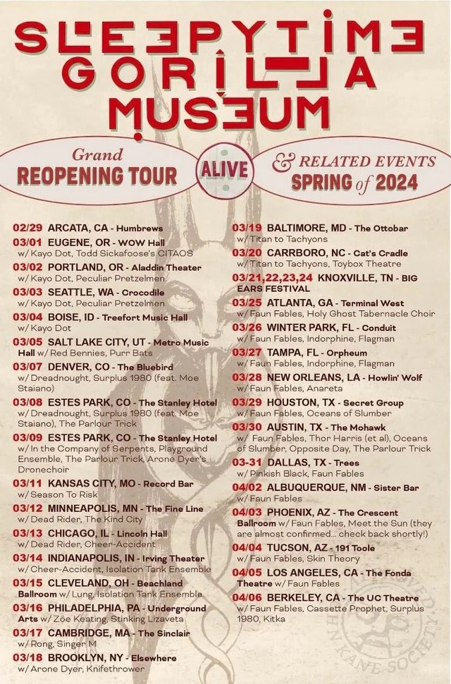 [DID NOT ATTEND: March 16, 2024] Sleepytime Gorilla Museum / Stinking Lizaveta / Zoë Keating